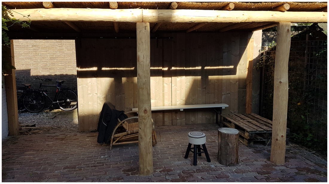 De robuuste geschilde Douglas boomstammen geven een stoere en natuurlijke uitstraling aan wat nu lijkt op een pergola.